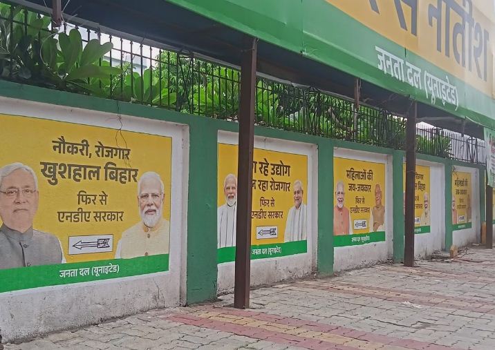 जेडीयू कार्यालय के बाहर मंगलवार को बड़ी संख्या में पोस्टर लगे हैं। कार्यालय की बाहरी दीवार इन पोस्टर से पटी हुई है। पोस्टर में पीएम मोदी और सीएम नीतीश की तस्वीरें हैं। उनके साथ अलग-अलग नारे लिखे गए हैं, महिलाओं की जय-जयकार, लग रहे उद्योग मिल रहा रोजगार, नौकरी रोजगार खुशहाल बिहार, फिर से एनडीए सरकार।