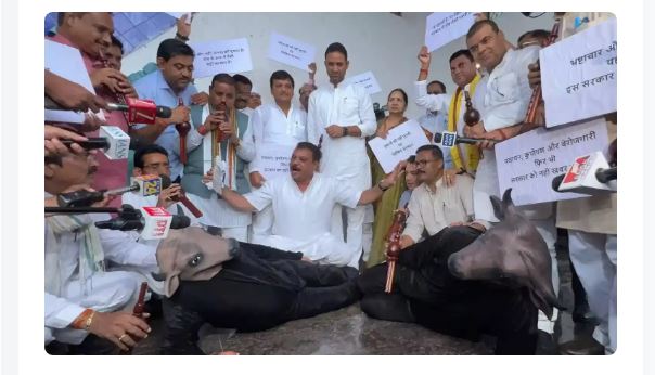भोपाल। मध्य प्रदेश विधानसभा के मानसून सत्र का दूसरा दिन कांग्रेस के प्रदर्शन के साथ शुरू हुआ। कांग्रेस विधायक प्रतीकात्मक रूप से भैंस बने और उनके सामने अन्य विधायकों ने बीन बजाकर विधानसभा परिसर में प्रदर्शन किया। प्रदर्शन पर कांग्रेस विधायकों ने कहा कि मध्य प्रदेश सरकार भैंस की तरह सोई हुई है। अन्य पिछड़ा वर्ग को 27 फीसदी आरक्षण नहीं मिल पा रहा है। युवाओं को नौकरी नहीं मिल रही है, हम सवाल लगाते हैं, तो सरकार जवाब नहीं देती है. ऐसे में हम उसे बीन बजाकर जगा रहे हैं।