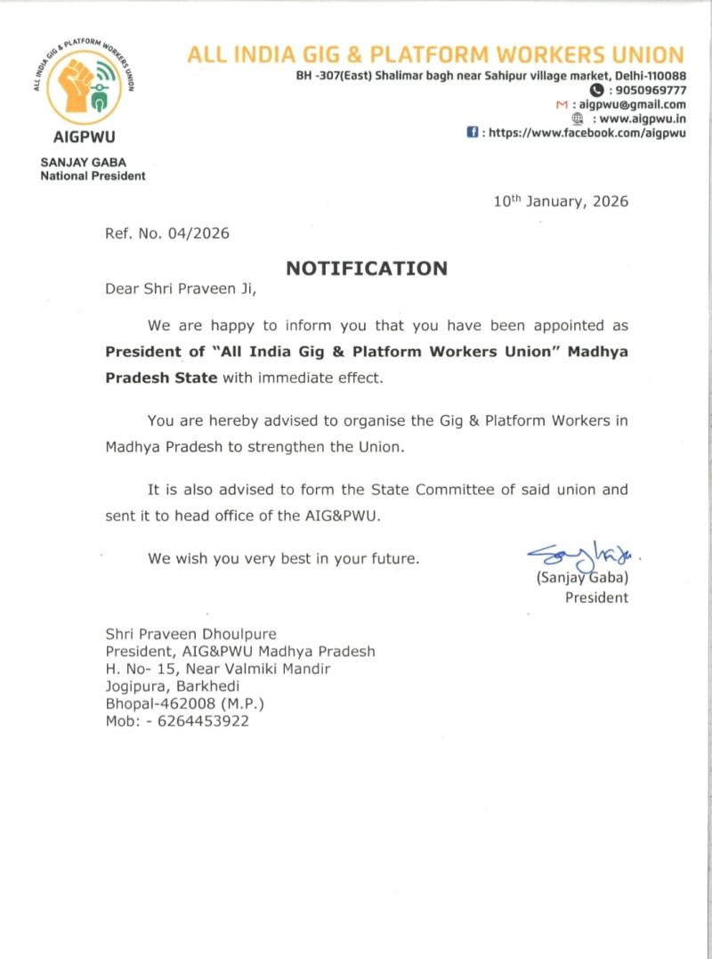 भोपाल। ऑल इंडिया गिग एंड प्लेटफ़ॉर्म वर्कर्स यूनियन (AIGPWU) द्वारा मुझे मध्यप्रदेश अध्यक्ष के रूप में जो महत्वपूर्ण जिम्मेदारी सौंपी गई है, उसके लिए मैं संगठन के राष्ट्रीय नेतृत्व, सभी पदाधिकारियों एवं साथियों का हृदय से आभार व्यक्त करता हूँ। यह दायित्व मेरे लिए केवल एक पद नहीं, बल्कि गिग एवं प्लेटफ़ॉर्म वर्कर्स के अधिकार, सम्मान और सुरक्षा की लड़ाई में एक संकल्प है। मध्यप्रदेश में गिग वर्कर्स को संगठित करना, उनकी आवाज़ को मजबूती देना और उन्हें न्याय दिलाना — यही मेरी सर्वोच्च प्राथमिकता रहेगी।