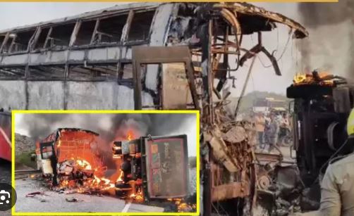 मार्कापुरम। के पास रायवरम में यात्रियों से भरी बस की टिपर लॉरी से टक्कर हो गई, जिसमें करीब 13 लोग जिंदा जल गए. जबकि करीब 20 लोग घायल हैं. हादसा इतना भयावह था कि बस पूरी तरह जलकर खाक हो गई. फिलहाल, सभी घायलों को उपचार के लिए अस्पताल में भर्ती कराया गया है और आपातकालीन सेवाएं मौके पर पहुंचकर राहत कार्य में जुटी हैं. पुलिस अधिकारियों के मुताबिक, बस हरिकृष्णा ट्रैवल्स की है, जो तेलंगाना के निर्मल से नेल्लोर जा रही थी. हादसा सुबह करीब साढ़े 6 बजे के आसपास का है. हादसे के वक्त बस में करीब 40 लोग सवार थे. जब बस रायवरम के पास पहुंची तो उसकी ट्रक से जोरदार टक्कर हो गई. टक्कर लगने के बाद बस में आग लग गई, जो तुरंत ही पूरी बस को अपनी जद में ले लिया. बस धू-धूकर जल गई. जिसमें 13 लोगों की मौत हो गई 20 लोगों को इलाज के लिए अस्पताल में भर्ती कराया गया है।